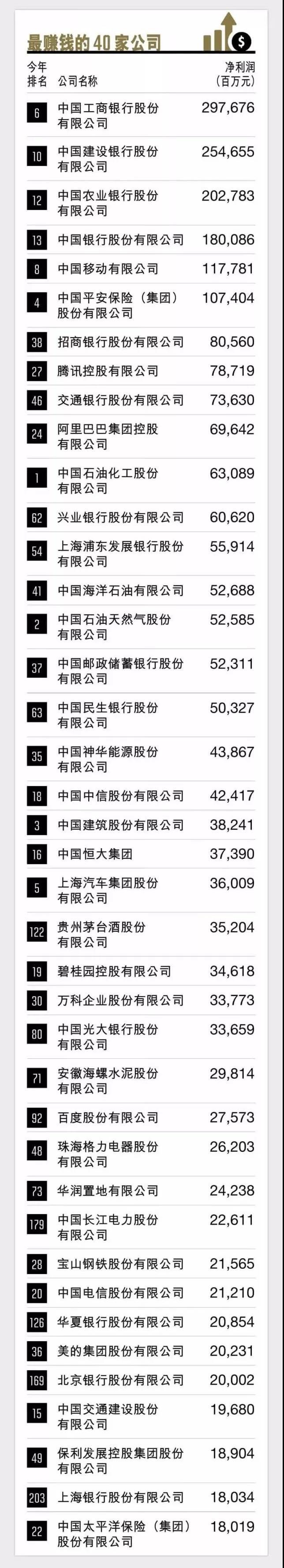 中國(guó)最賺錢(qián)的40家公司,福建僅興業(yè)銀行上榜,排名第12名。在盈利能力方面,與去年情況相同,最賺錢(qián)的10家上市公司除了幾大商業(yè)銀行和保險(xiǎn)公司之外,仍是中國(guó)移動(dòng)有限公司、騰訊控股有限公司和阿里巴巴集團(tuán)控股有限公司。這十家公司在去年的總利潤(rùn)達(dá)到1.46萬(wàn)億,占全部上榜公司利潤(rùn)總和的40.3%。