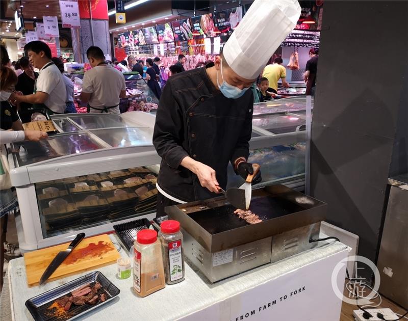 現(xiàn)場(chǎng)還增加了牛排試吃區(qū),有不少顧客在此排隊(duì)試吃。此外,入口處超市的烘焙面積增大,也增加了試吃區(qū)域,產(chǎn)品性?xún)r(jià)較高,例如一盒紅絲絨蛋糕12.8元、瑞士卷12.8元。而在山姆會(huì)員商店,一盒紅絲絨蛋糕售價(jià)為99元,一盒瑞士卷為68元。不過(guò),永輝超市倉(cāng)儲(chǔ)店的烘焙產(chǎn)品在分量上有所調(diào)整,較為適合個(gè)人以及小家庭購(gòu)買(mǎi),因此單價(jià)較低。