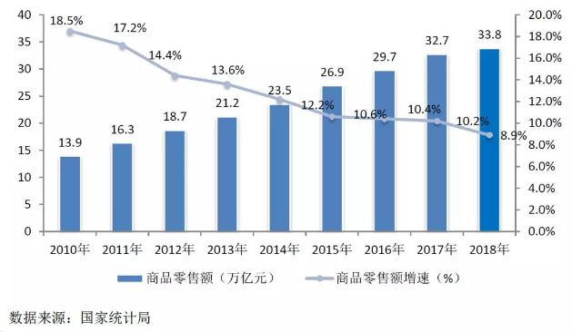 圖/2010-2018年我國(guó)商品零售額及增速