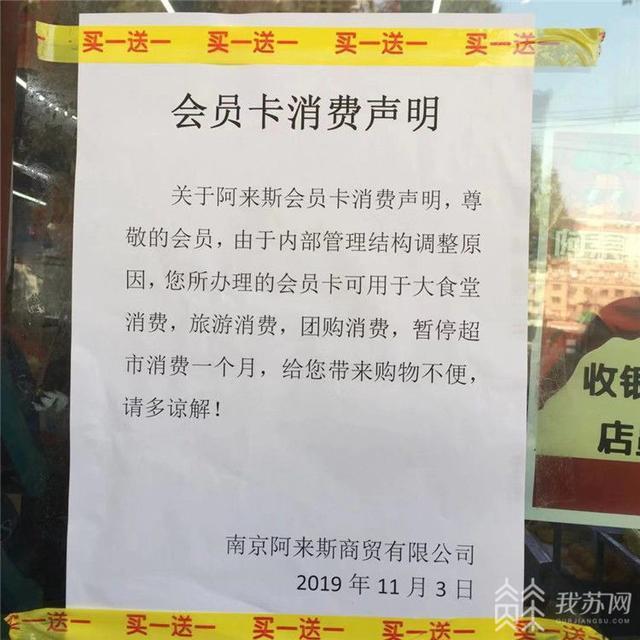 記者了解到,11月3日這家生鮮超市曾經(jīng)貼出一則會員停用通知,上面寫道:阿來斯資金鏈斷裂不與超市結(jié)賬,負(fù)責(zé)人不露面解決問題,所有會員暫停使用,等阿來斯負(fù)責(zé)人陶某露面解決賬務(wù)問題再另行協(xié)商。阿來斯商貿(mào)公司負(fù)責(zé)人陶某告訴我蘇特報記者,超市突然關(guān)門是因?yàn)楣九c承包商出現(xiàn)了糾紛。