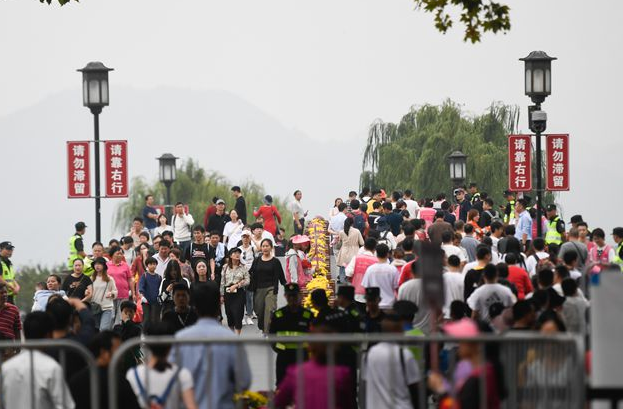 2019年國慶期間全國共接待國內(nèi)游客7.82億人次。圖為杭州西湖風(fēng)景區(qū)斷橋,新華社圖。