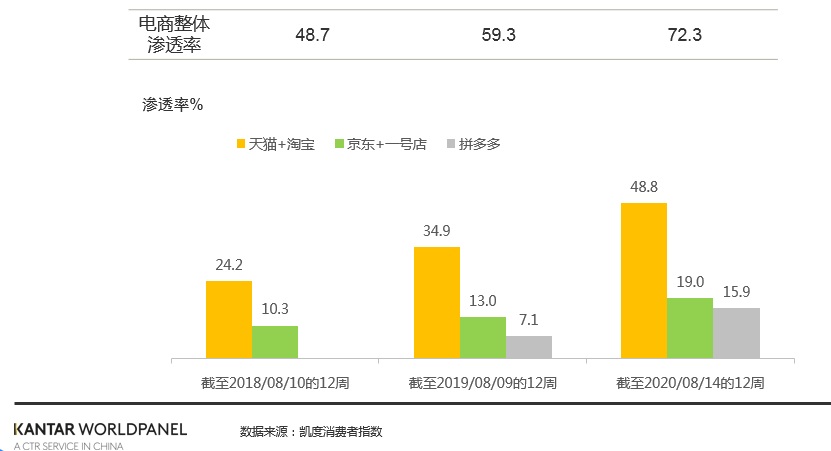 最新報(bào)告也指出,電商繼續(xù)保持43.5%的強(qiáng)勢增長,因?yàn)樽孕鹿谝咔橐詠恚袊M(fèi)者已經(jīng)習(xí)慣于網(wǎng)購。過去12周,72.3%的中國城市家庭在線上購買了快速消費(fèi)品,消費(fèi)者規(guī)模顯著增加。阿里巴巴以45.8%的線上市場份額(+1.7)保持領(lǐng)先地位,而京東的市場份額略微下降了0.2個(gè)百分點(diǎn)。