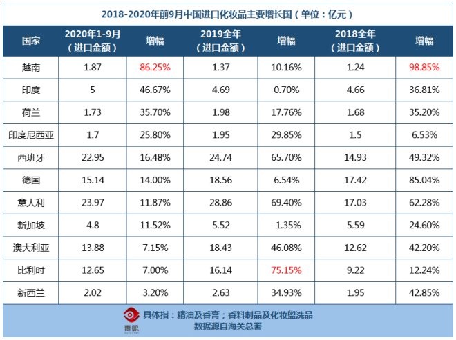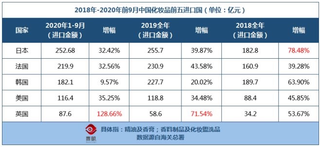 而從進(jìn)口國來看,日本、法國、韓國仍為前三,小眾國家化妝品也仍有不小的潛力。
