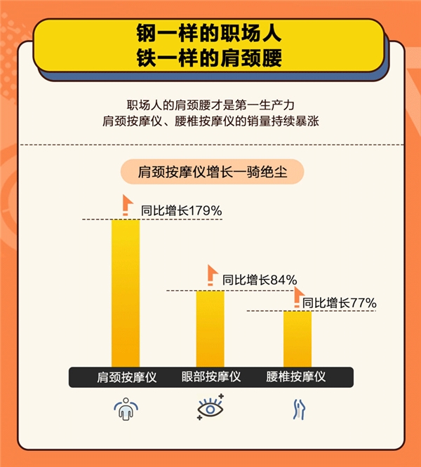 什么值得買數(shù)據(jù)顯示,2020年“雙11”期間,肩頸按摩儀銷量同比增長179%,眼部按摩儀增長84%,腰椎按摩儀增長77%。