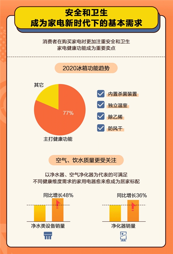 什么值得買數(shù)據(jù)顯示,消費者在購買家電時更加注重安全和衛(wèi)生,健康功能已成為家電最重要賣點。以冰箱為例,“雙11”期間,主打健康安全功能的冰箱,在冰箱總銷量中占比高達77%。而以凈水器、空氣凈化器為代表的、可滿足不同健康維度需求的家用電器,愈來愈而成為居家標配,二者的銷量分別同比增長48%和36%。并且,智能家居尤其是全屋智能化家居解決方案,正在成為新趨勢。