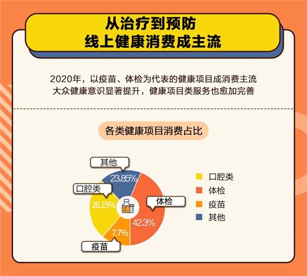 數(shù)據(jù)顯示,常規(guī)體檢、疫苗等產(chǎn)品熱銷,二者在健康項目總消費中的占比合計高達約50%。此外,口腔類健康項目的占比也高達26.15%,顯示口腔護理正日益受到重視。