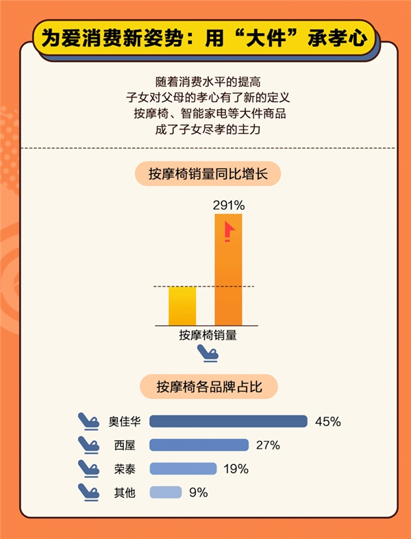 數(shù)據(jù)顯示,2020年,子女對父母的孝心有了新的定義,按摩椅、智能家電等“大件商品”,成為子女“孝心消費”的代表性產(chǎn)品,其中,按摩椅的銷量同比大增291%。而為每個家庭的幸福生活提供堅實保障的煙機灶具、烤箱,銷量分別同比大增175%、99%。