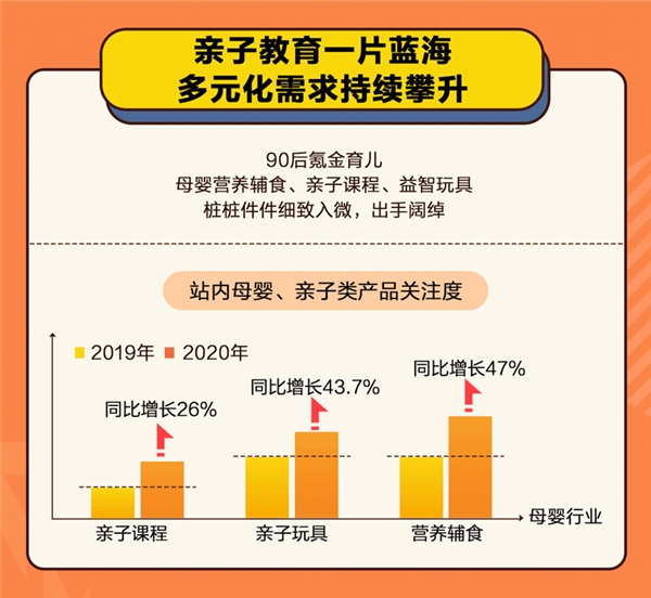 親子教育,則是家庭消費的另一種重要內(nèi)容,并且,90后父母表現(xiàn)出明顯的“氪金育兒”傾向,母嬰營養(yǎng)輔食、親子課程、益智玩具等等,細致入微,消費選擇日益多元。其中,營養(yǎng)輔食、親子玩具、親子課程,銷量分別同比增長47%、43.7%和26%。此外,舉家出游也成為消費者熱選,親子樂園景區(qū)度假廣受歡迎。
