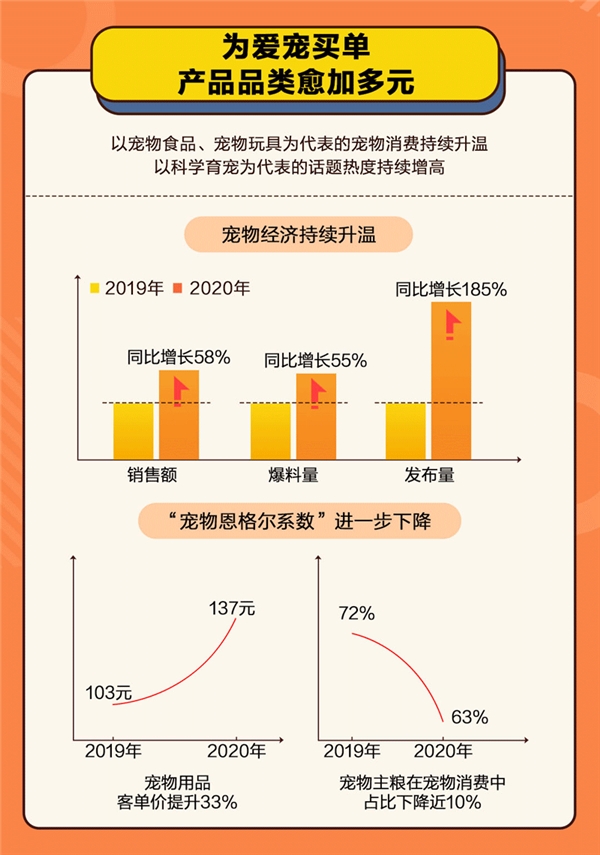 “雙11”期間,寵物用品銷售額同比增長58%,而客單價則從2019年103元增長至2020年的137元,增幅33%,不過,寵物主糧在寵物消費中的占比卻下降了近10%。