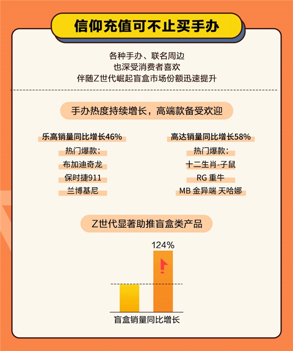 什么值得買數(shù)據(jù)顯示,2020年“雙11”期間,深受Z世代消費者喜愛的手辦、聯(lián)名周邊,正在快速崛起。其中,樂高、高達手辦銷量分別同比增長46%和58%,而盲盒類產(chǎn)品銷量更是同比大增124%。樂于為信仰充值的新生代消費者,讓這些昔日的邊緣市場正在逐漸成長為主流。