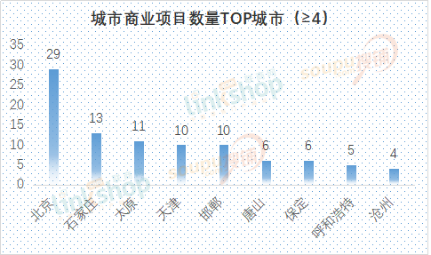 從各城市新增商業(yè)項目數(shù)量來看,新增4家及以上擬開業(yè)的城市有北京、石家莊、太原、天津、邯鄲、唐山、保定、呼和浩特和滄州。其中,作為省會城市,石家莊擬新開業(yè)項目達(dá)13家,太原擬新開業(yè)項目達(dá)到11家。這些上榜城市多為直轄市、省會城市或者省級副中心城市。