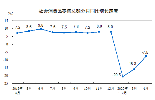 5月15日,國家統(tǒng)計(jì)局官網(wǎng)發(fā)布的信息顯示,4月份,社會消費(fèi)品零售總額28178億元,同比下降7.5%(扣除價(jià)格因素實(shí)際下降9.1%,以下除特殊說明外均為名義增長),降幅比上月收窄8.3個(gè)百分點(diǎn)。 ...