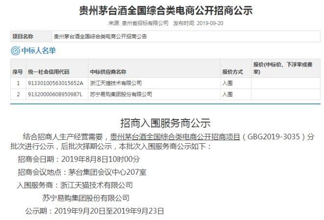 9月20日,貴州省招標(biāo)投標(biāo)公共服務(wù)平臺(tái)發(fā)布了《貴州茅臺(tái)酒全國綜合類電商公開招商公示》,據(jù)公示顯示,天貓超市與蘇寧易購入圍茅臺(tái)電商渠道服務(wù)商,這是茅臺(tái)酒首次面向綜合類電商渠道投放。 ...
