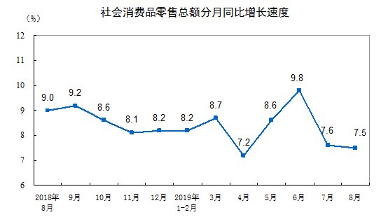 2019年8月份,社會消費品零售總額33896億元,同比名義增長7.5%(扣除價格因素實際增長5.6%,以下除特殊說明外均為名義增長)。 ...
