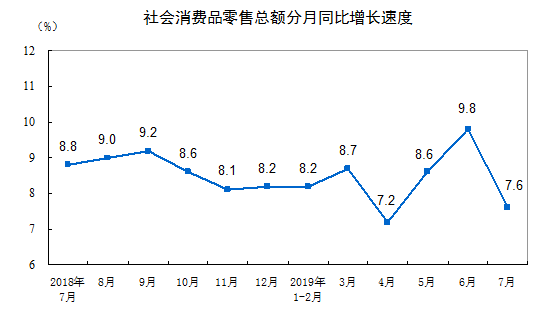 從國家統(tǒng)計局獲悉,2019年7月份,社會消費品零售總額33073億元,同比名義增長7.6%(扣除價格因素實際增長5.7%,以下除特殊說明外均為名義增長)。 ...