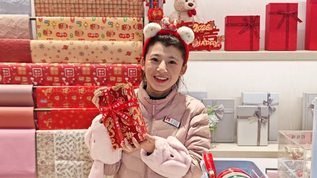 永輝北京魯谷店的禮盒專區(qū),一位年輕顧客正在仔細(xì)比較兩款堅(jiān)果禮盒。她最終選擇了永輝與森寶聯(lián)名的“駿馬獻(xiàn)瑞”禮盒,“設(shè)計(jì)有年味,品牌也熟悉,價(jià)格很合適”。不遠(yuǎn)處的服務(wù)臺(tái)前,工作人員正熟練地為顧客選購的草莓和車?yán)遄舆M(jìn)行禮品包裝。紅色禮盒配上金色絲帶,旁邊還有一張手寫的祝??ㄆ?/span>——這是永輝今年新增的“手寫祝福”服務(wù),讓標(biāo)準(zhǔn)化商品多了份人情溫度。