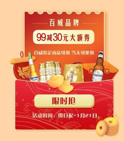 即日起到1月21日,永輝生活-詠悅匯酒庫平臺發(fā)放百威品牌5元無門檻優(yōu)惠券(限時搶,當天可使用)、百威品牌99減30元大額券(當天可使用)。而且同時期,下單百威品牌滿1元抽好禮,可以抽任天堂switch游戲機、奔赴山海自行車、囤貨小推車精美獎品。