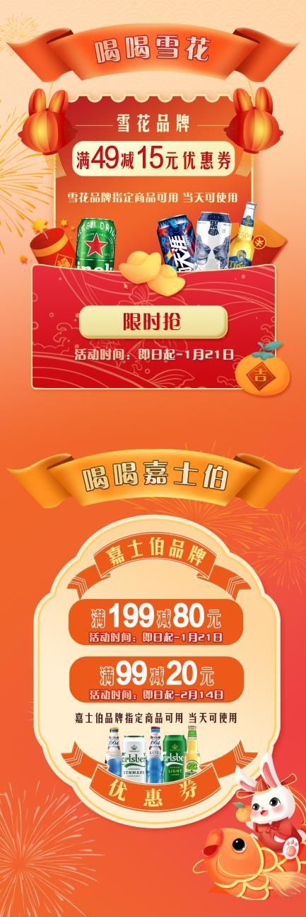 雪花、嘉士伯愛好者也可以去詠悅匯酒庫領(lǐng)券購酒。即日起到1月21日,永輝生活-詠悅匯酒庫平臺會發(fā)放雪花品牌滿38減8元券(當天可使用)、雪花品牌滿49減15元優(yōu)惠券(當天可使用)、嘉士伯品牌滿199減80元的大額券(當天可使用),即日起到2月14日,還會發(fā)放嘉士伯滿99減20元優(yōu)惠券(當天可使用)。