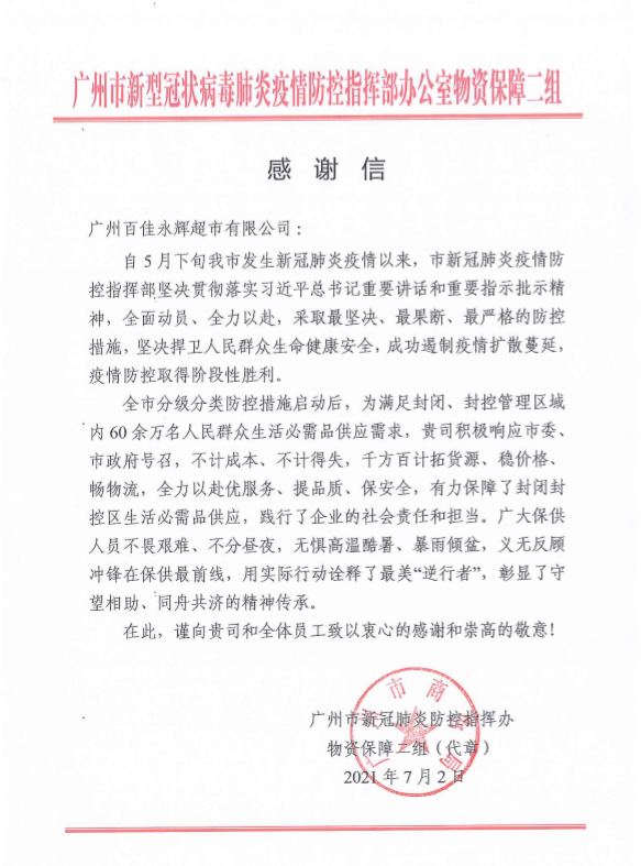 近日,廣州百佳永輝超市收到來自廣州市新冠肺炎防控指揮辦物資保障組的感謝信,信中對永輝在疫情期間為保供保價格所做的努力表示感謝。 ...