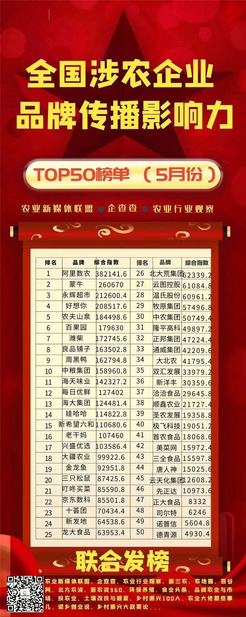 5月份全國涉農(nóng)企業(yè)品牌傳播影響力TOP50發(fā)布 永輝名列前三